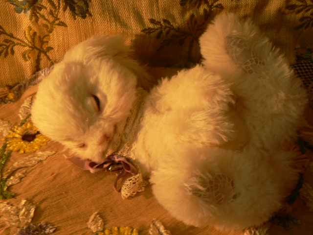 アンティークレースを幾つか重ねて首元にまいてあります右側にずれたような表情を出したかったので本体に軽くとじつけてあります。