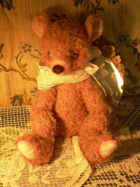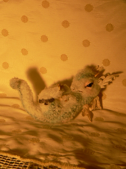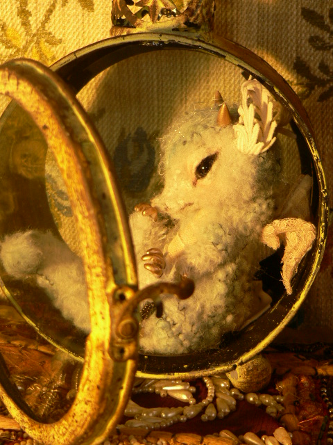 グラスアイはかたつむりの絵本さんのアメジスト色のを使いました。小さい翼はアンティークレースを重ねてアクリルのコードを入れて曲げられるようになっています。