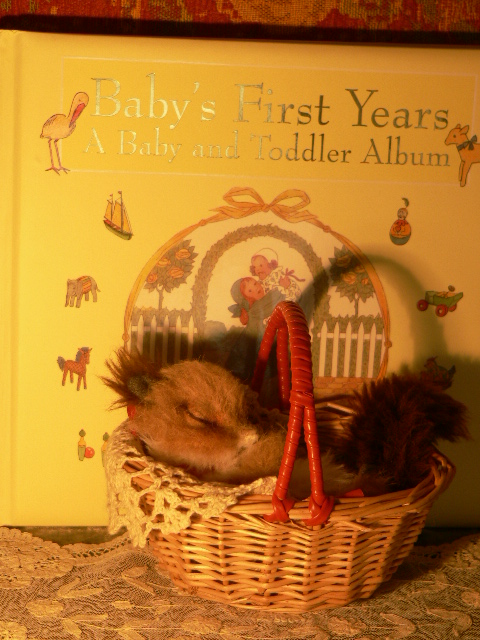 ねんねのリスです。赤い持ち手のかごに入っています。