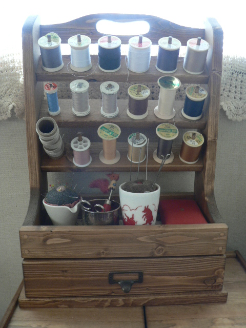 スプールホルダーです。糸が18巻き立てられ、針刺しをおく場所も丁度良い位置に。小引き出しにはハサミやほつれ留めなどを入れています。