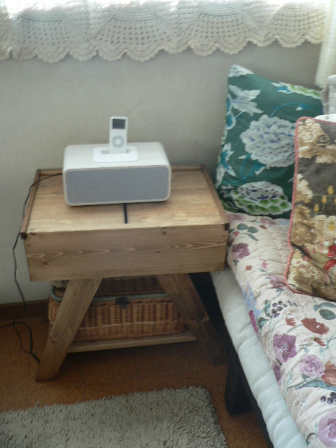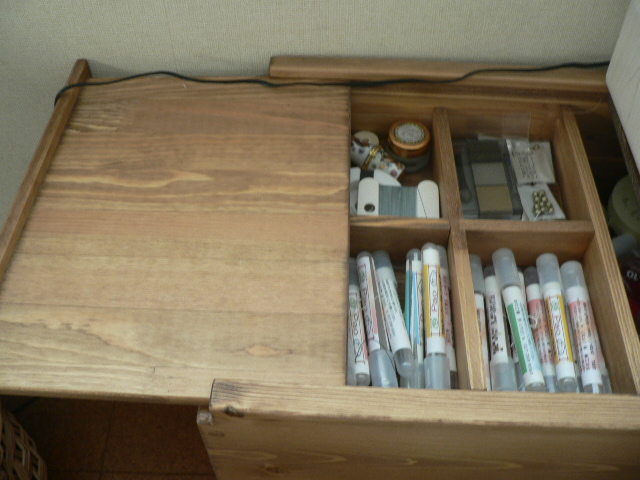 足の長いおはり箱は棚部分に色鉛筆やマーカーを入れたバスケットをおいてあります。いつも作業をしているカウチに座ってちょうどの高さで大抵はスピーカーをのっけて音楽を聞きながらの作業です。