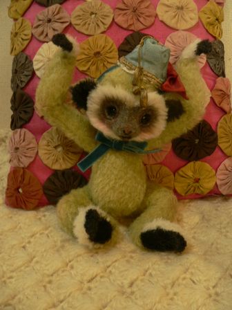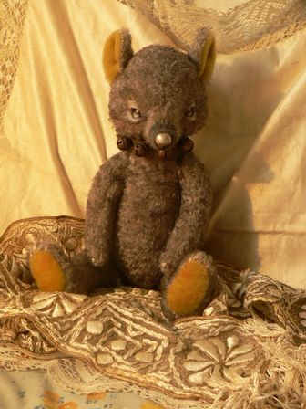 小さい子は7cm、からし色のシルクリボン、グラスアイなし。