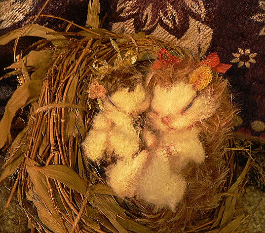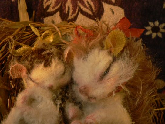 ハリネズミ姉妹、大きい子は11cmで赤いシルクリボン。グラスアイ入り。