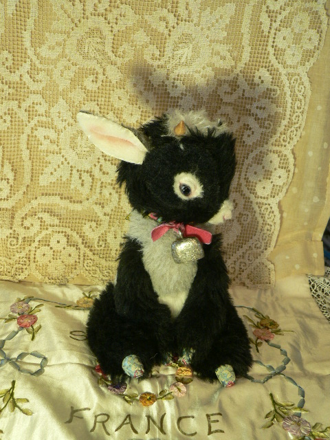 耳とパッドにはみっしりとした刺繍のアンティーク生地を使いました。