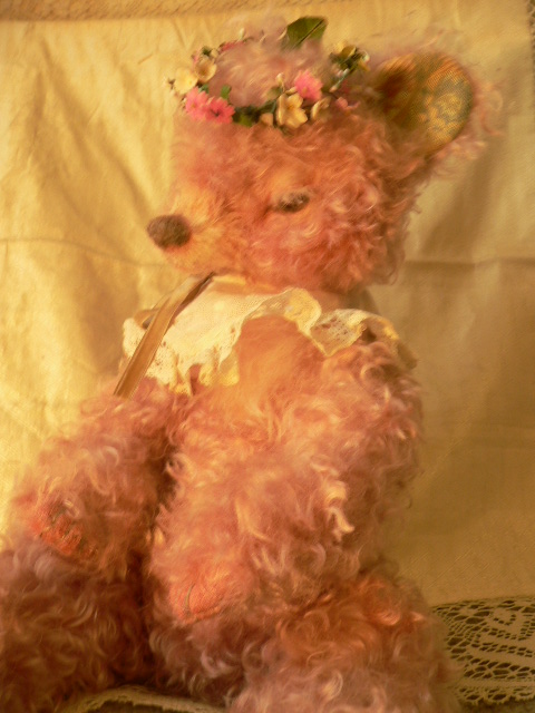 ピンクに染めたモヘアのベア。まつ毛つきです。