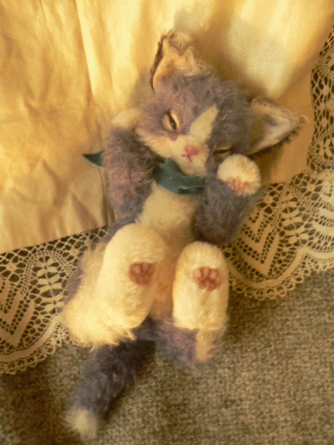 オルゴール入りのネコ。白とブルーのバイカラーです。